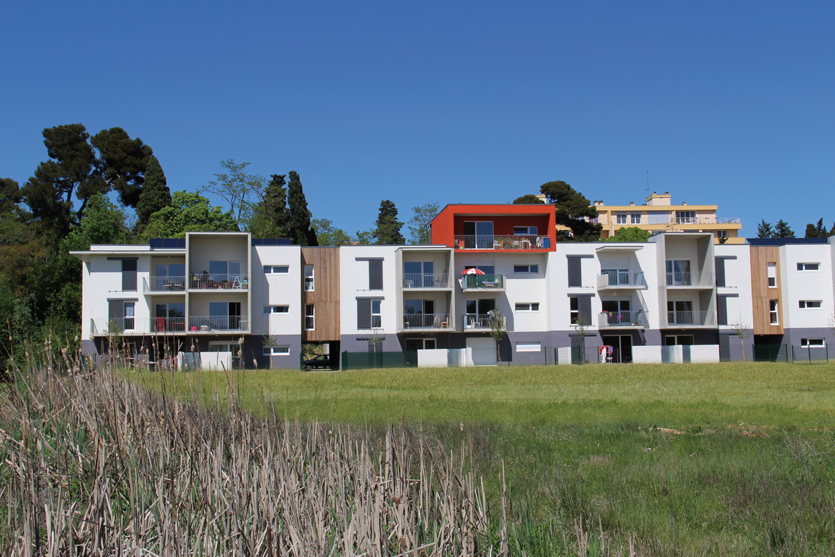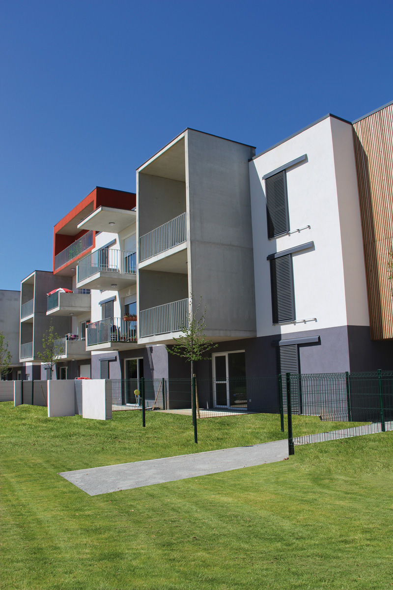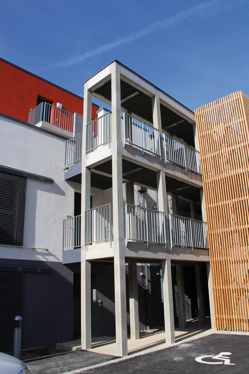 Ces 25 logements sociaux s'intègrent dans un projet global qui comprendra à terme un gymnase, une maison de quartier, l'ensemble articulé autour d'un parc. Les logements sont répartis sur une construction en R+2 avec 1 logement ponctuel en R+3 repérable par son enduit contrasté. Orientés Nord/Sud, ils sont implantés dans une logique de continuité de la ville. Les habitations sont distribuées par une coursive extérieure Nord alliant bois et métal galvanisé. Deux percées en RdC les connectent au Parc. Des panneaux solaires s'intègrent discrètement en toiture pour satisfaire la démarche de développement durable.