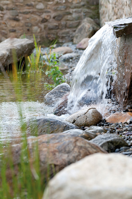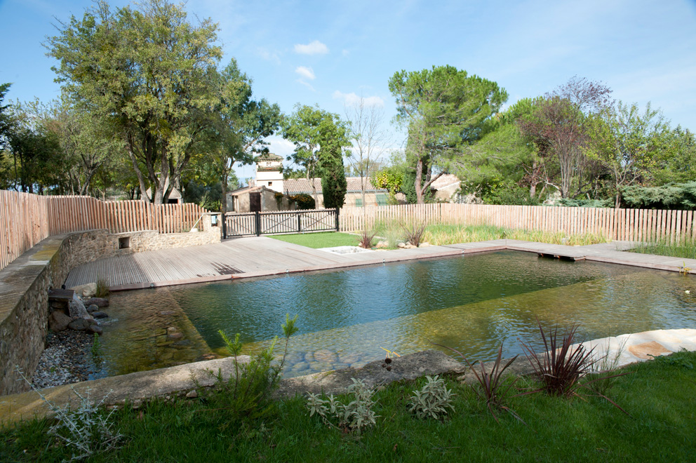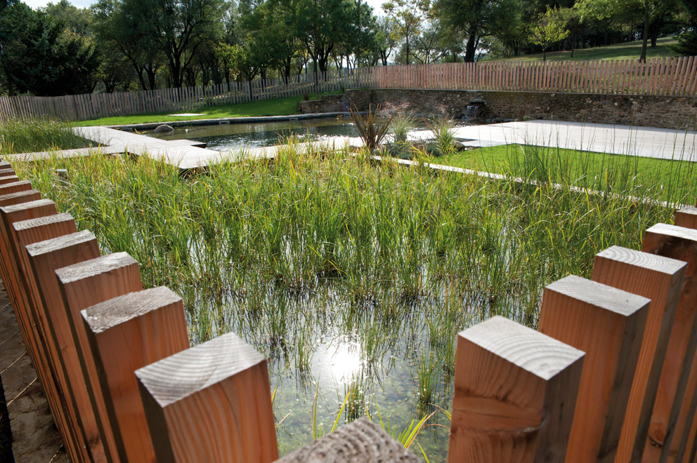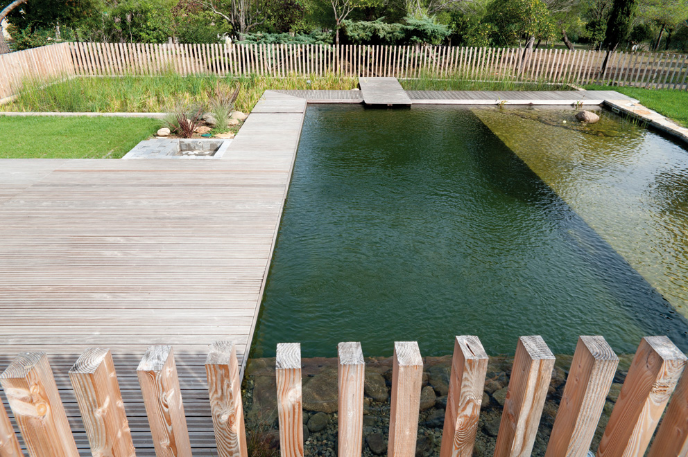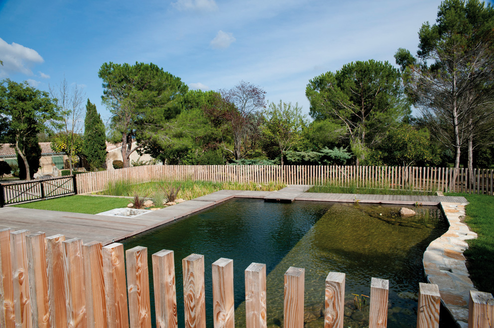 Une piscine qui permet de nager dans un écosystème complet, et qui offre l'opportunité de se fondre dans les charmes de la nature. Ce concept biologique propose un assemblage de minéraux nécessaire à l'épuration de l'eau, et des végétaux garantissant la qualité de l'eau. Le bassin sert d'agrément où vont pouvoir s'épanouir des poissons et des plantes aquatiques de type nénuphars. Bordé par une clôture constituée de pieux en bois, le bassin offre une intégration parfaite dans ce paysage naturel.