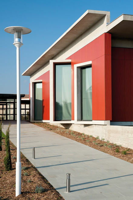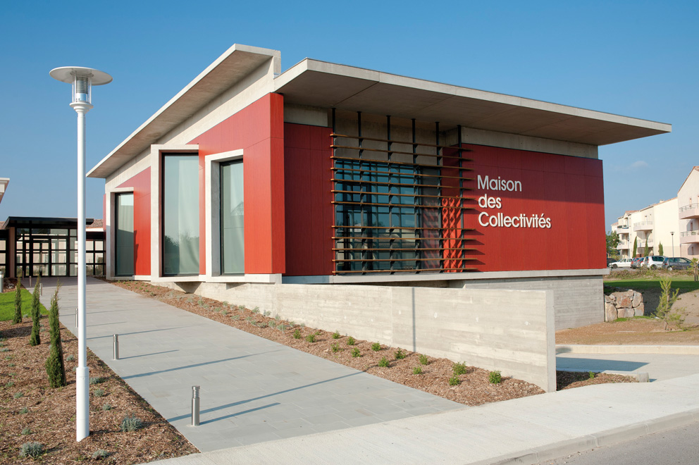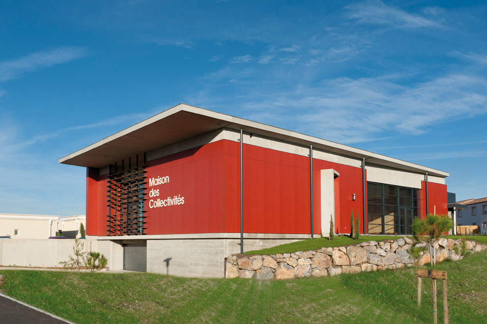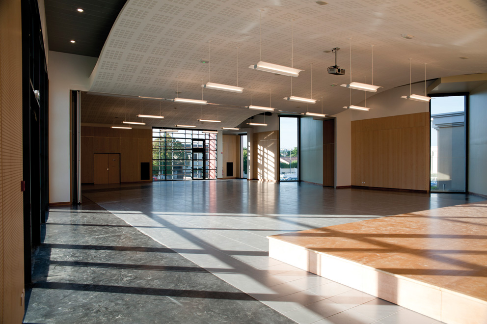 Création d'une salle de réception / conférence de 400 places qui propose une écriture contemporaine avec un volume et un gabarit répondant à l'usage et à la fonction attendue. La hauteur intérieure offre un espace généreux avec des proportions agréables. Les façades sont traitées par une isolation extérieure, le matériaux employé est d'une teinte volontairement affirmée qui donne l'identité requise à cette salle spécifique. L'accessibilité est traitée sans être percevable, elle permet à tous de pratiquer les mêmes cheminements pour pénétrer tous les espaces.