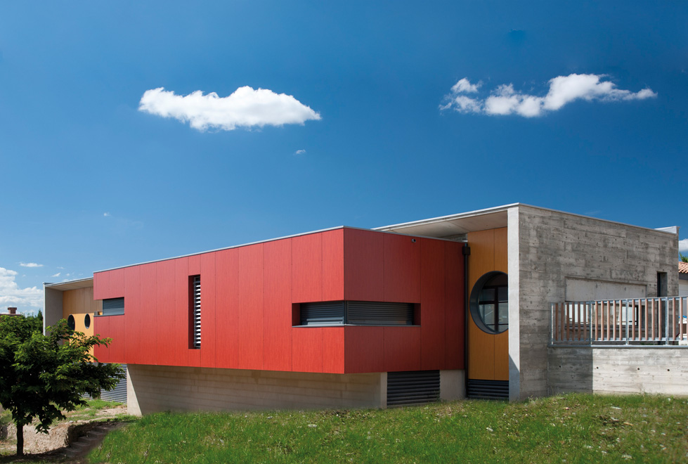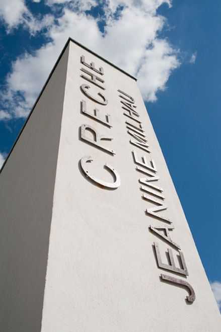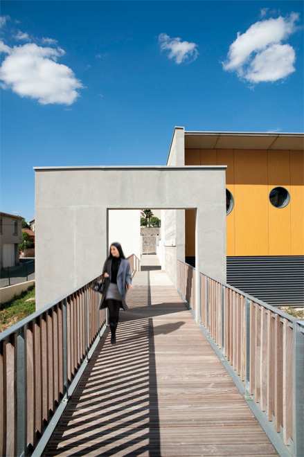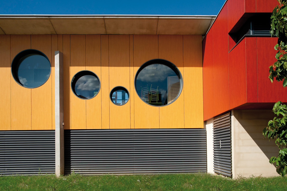Rattachée à la cour existante et connectée par sa passerelle aérienne, la crèche vient s'inscrire dans ce lieu déjà occupé par la petite enfance. Les ouvertures sur la cour, largement dimensionnées, mettent en relation les espaces extérieurs et intérieurs. La façade Sud propose des ouvertures circulaires distribuées sur les différents locaux. Cette façade reste inscrite dans un cadre bien défini, et le traitement spécifique des ouvertures apporte une expression ludique, tant au niveau de sa perception extérieure que de son vécu intérieur.