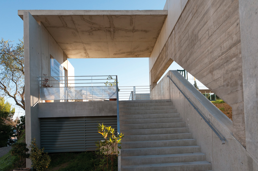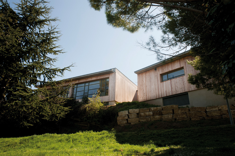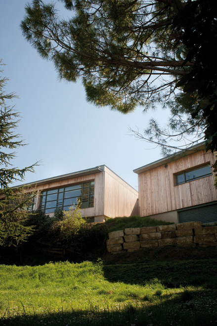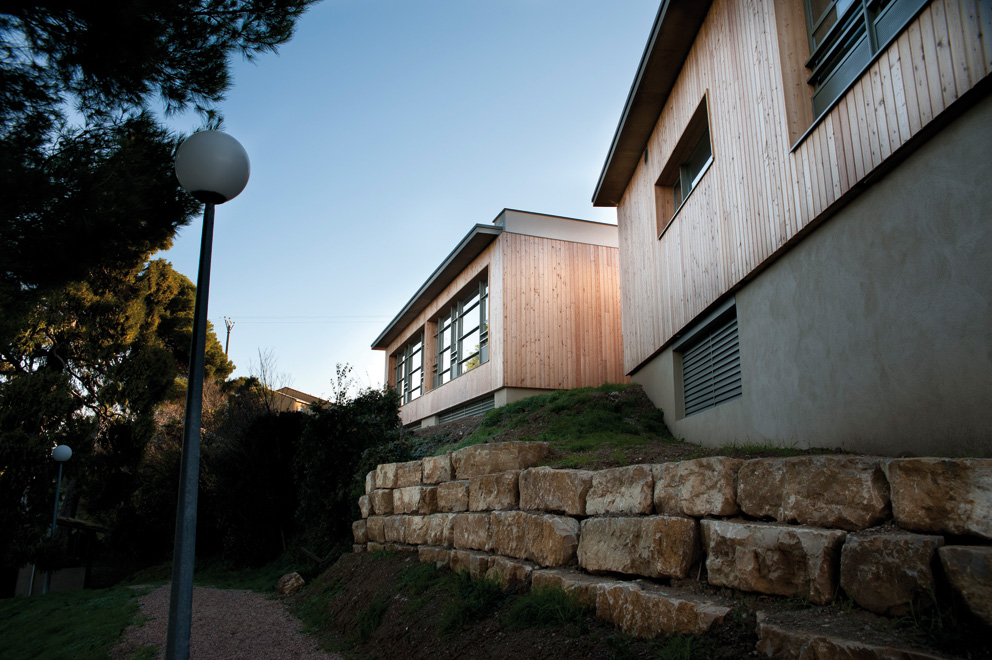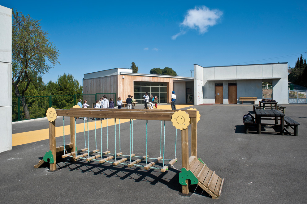 La cour de récréation vient épouser la géométrie du terrain, elle offre une forme libre et douce en évitant toute zone de non surveillance. Cet espace extérieur articule et donne accès aux différentes entités du bâti. Une galerie propose les accès à tous les espaces. L'implantation des deux modules d'activités offre une vue et une profondeur sur le Nord, ces espaces s'ouvrent sur les paysages authentiques de la région. L'ensemble est traité avec une vêture bois et isolation par l'extérieur, la matière (mélèze naturel) offre une légèreté à la composition en surplomb du talus.
