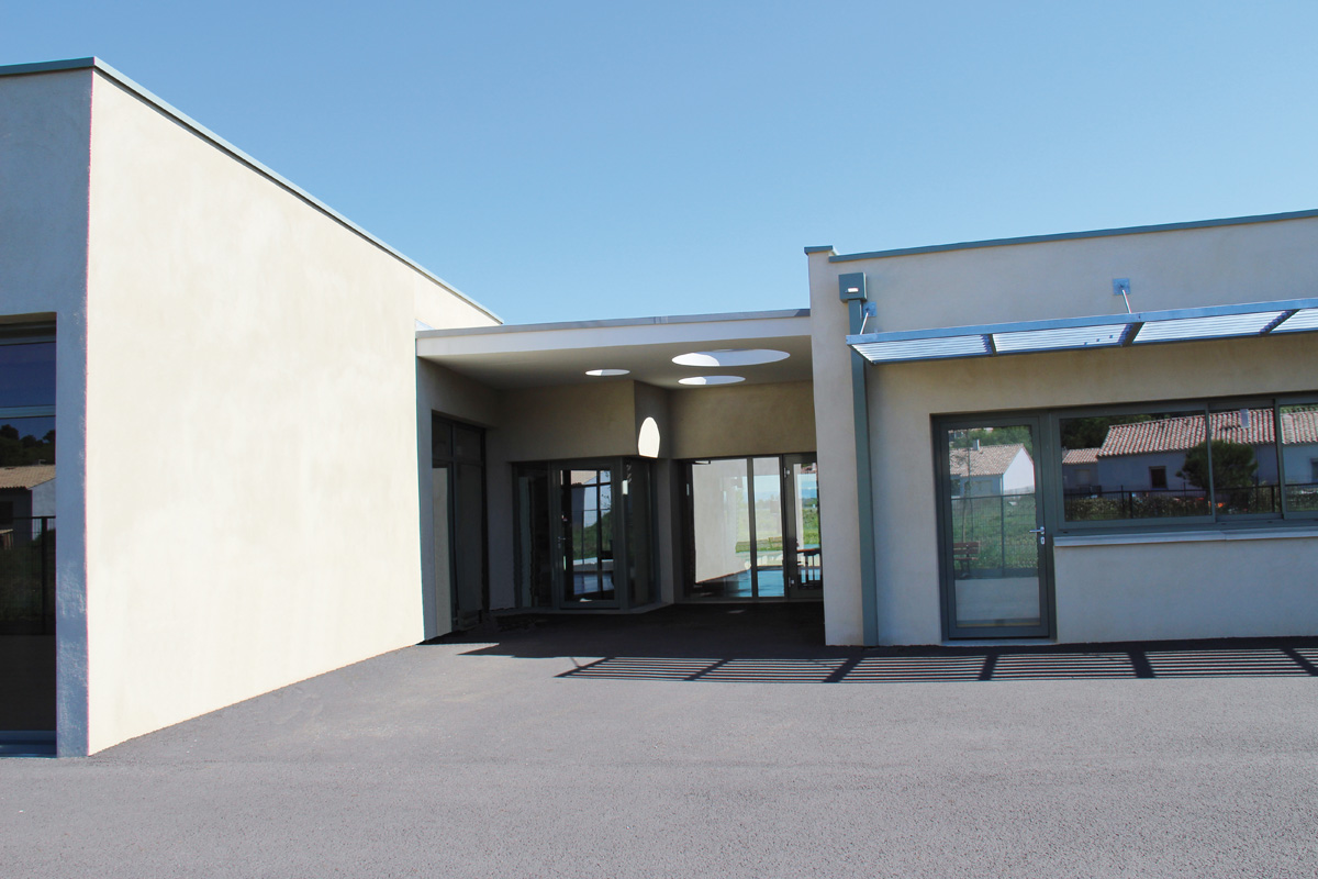 Le projet est implanté sur les abords directs du centre ancien, les ligatures existantes proposent des accès piétons qui nous amènent en toute sécurité jusqu'à la porte d'entrée. Le bâtiment abrite deux classes primaires, une salle de restauration avec son office de réchauffage attenant, un pôle garderie et un préau couvert pouvant être entièrement fermé pour accueillir les activités périscolaires.